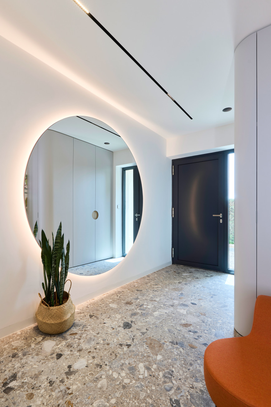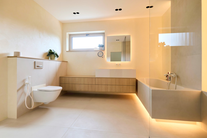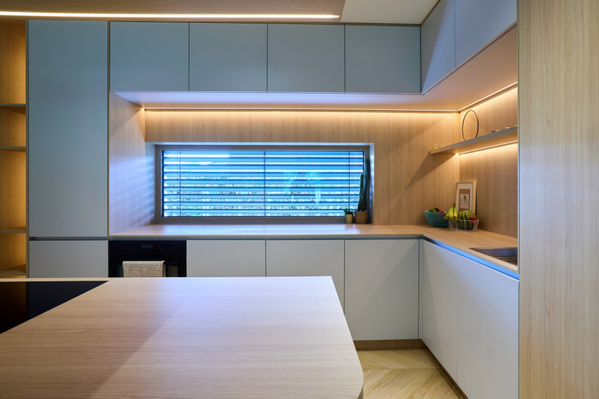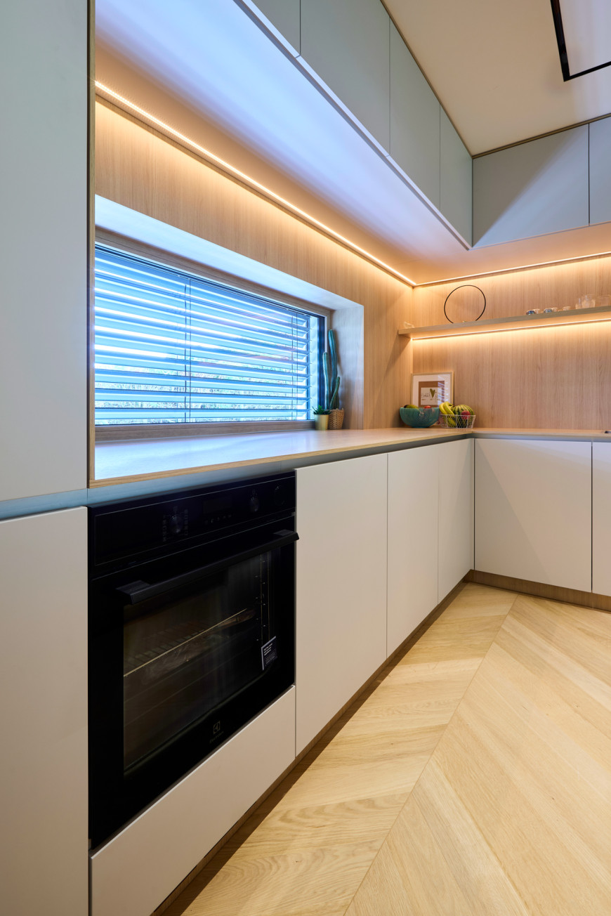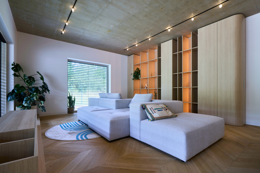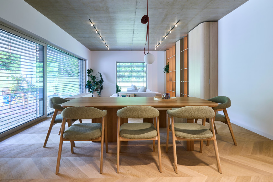 Throughout the entire home, the Vincenza Oak decor is a unifying element that connects individual rooms and creates a pleasant, warm atmosphere. Most of the furniture is made from laminated chipboard in Vincenza Oak, while the kitchen countertops and backsplashes are crafted from MDF with a durable HPL surface in the same finish—ensuring high resistance and easy maintenance. A distinctive feature of the interior is the use of curved forms, achieved through Roliflex flexible plywood with an HPL surface. This allowed for smooth detailing and a soft, well-thought-out design expression. In the dining area, we crafted a solid oak table and bench, adding a touch of honest craftsmanship and a natural contrast to the laminated furniture. The entry hallway was finished with spray-painted MDF, allowing for precise color matching and clean surfaces without visible joints. Throughout the house, we installed flush reverse doors with concealed frames, which contribute to the elegant look and maintain the purity of the wall surfaces without visual disruption.