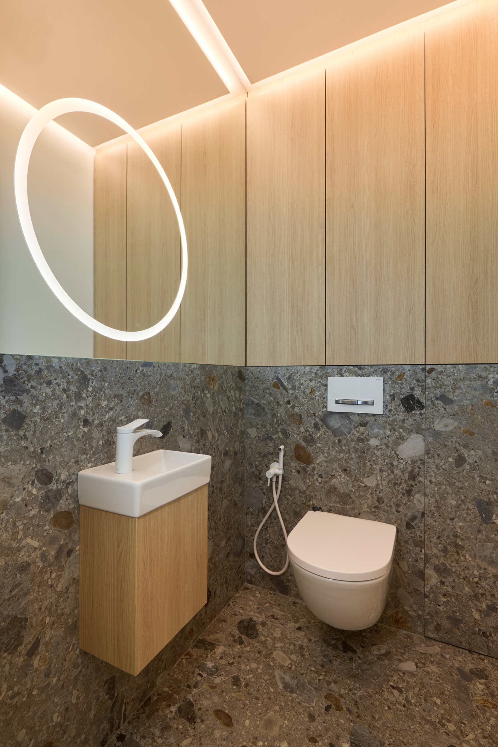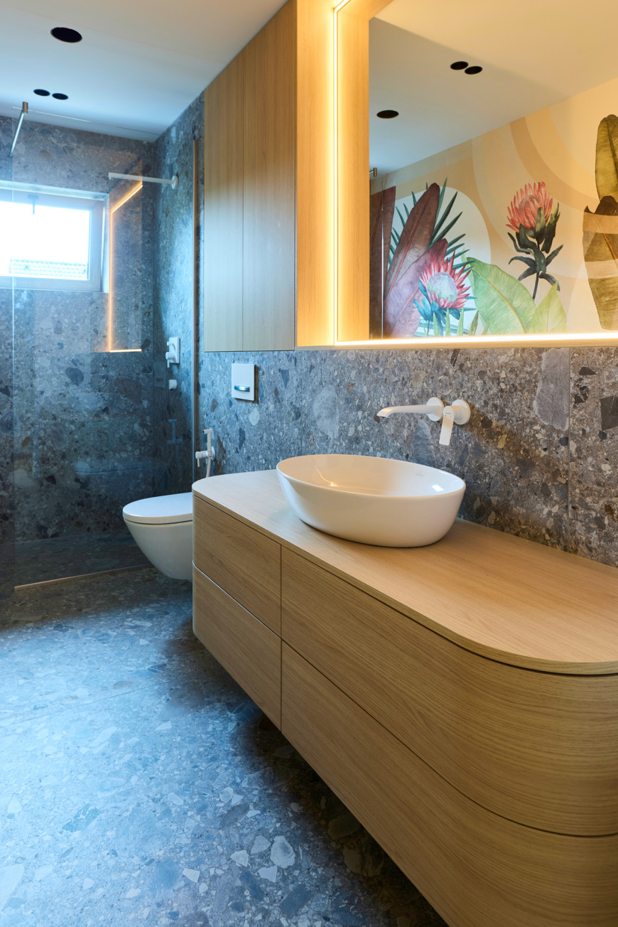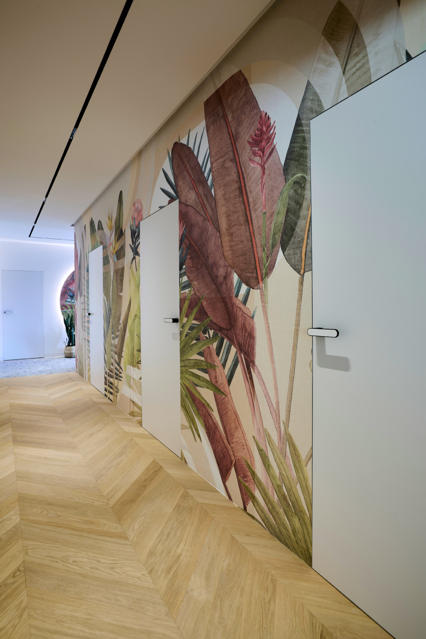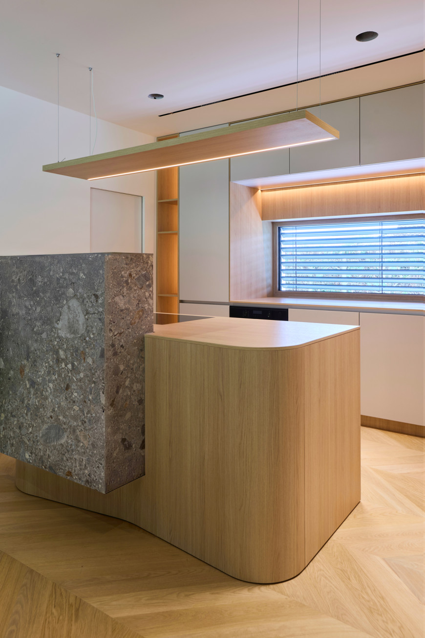 Throughout the entire home, the Vincenza Oak decor is a unifying element that connects individual rooms and creates a pleasant, warm atmosphere. Most of the furniture is made from laminated chipboard in Vincenza Oak, while the kitchen countertops and backsplashes are crafted from MDF with a durable HPL surface in the same finish—ensuring high resistance and easy maintenance. A distinctive feature of the interior is the use of curved forms, achieved through Roliflex flexible plywood with an HPL surface. This allowed for smooth detailing and a soft, well-thought-out design expression. In the dining area, we crafted a solid oak table and bench, adding a touch of honest craftsmanship and a natural contrast to the laminated furniture. The entry hallway was finished with spray-painted MDF, allowing for precise color matching and clean surfaces without visible joints. Throughout the house, we installed flush reverse doors with concealed frames, which contribute to the elegant look and maintain the purity of the wall surfaces without visual disruption.