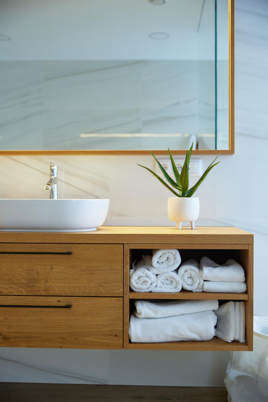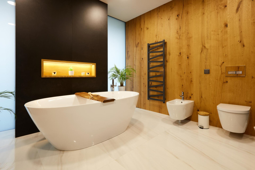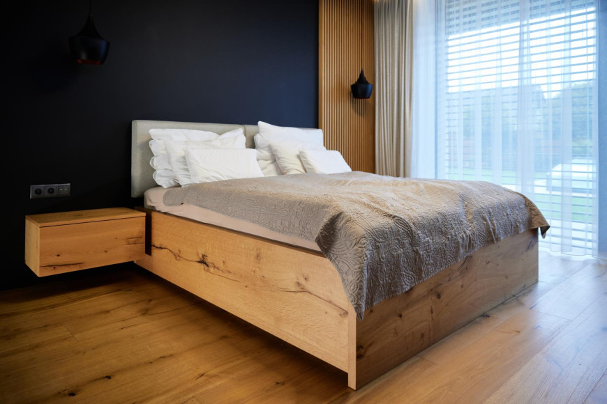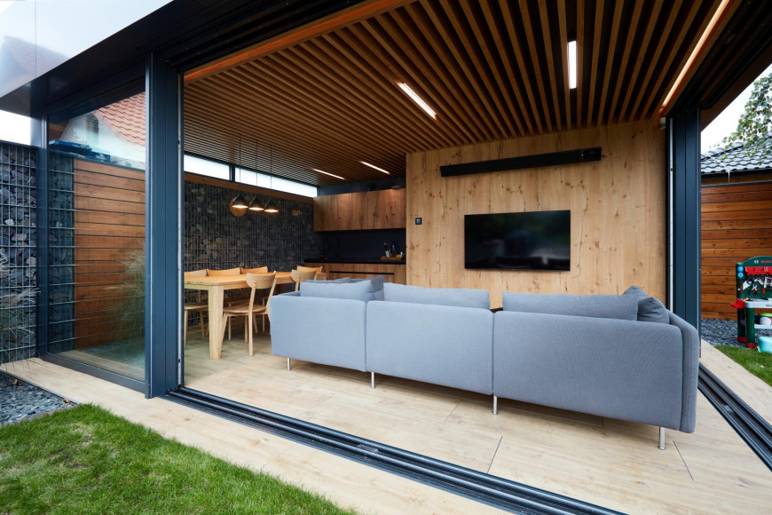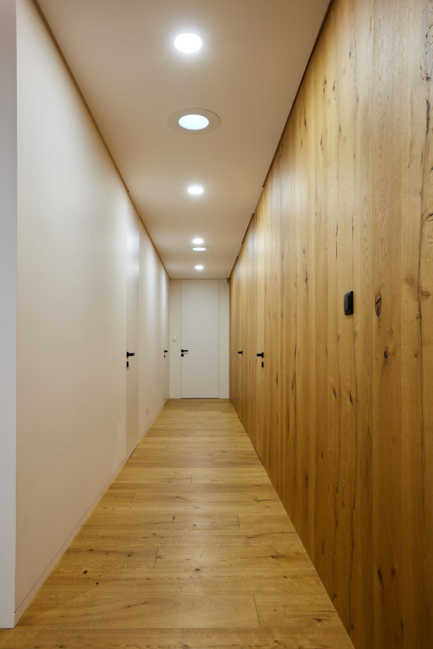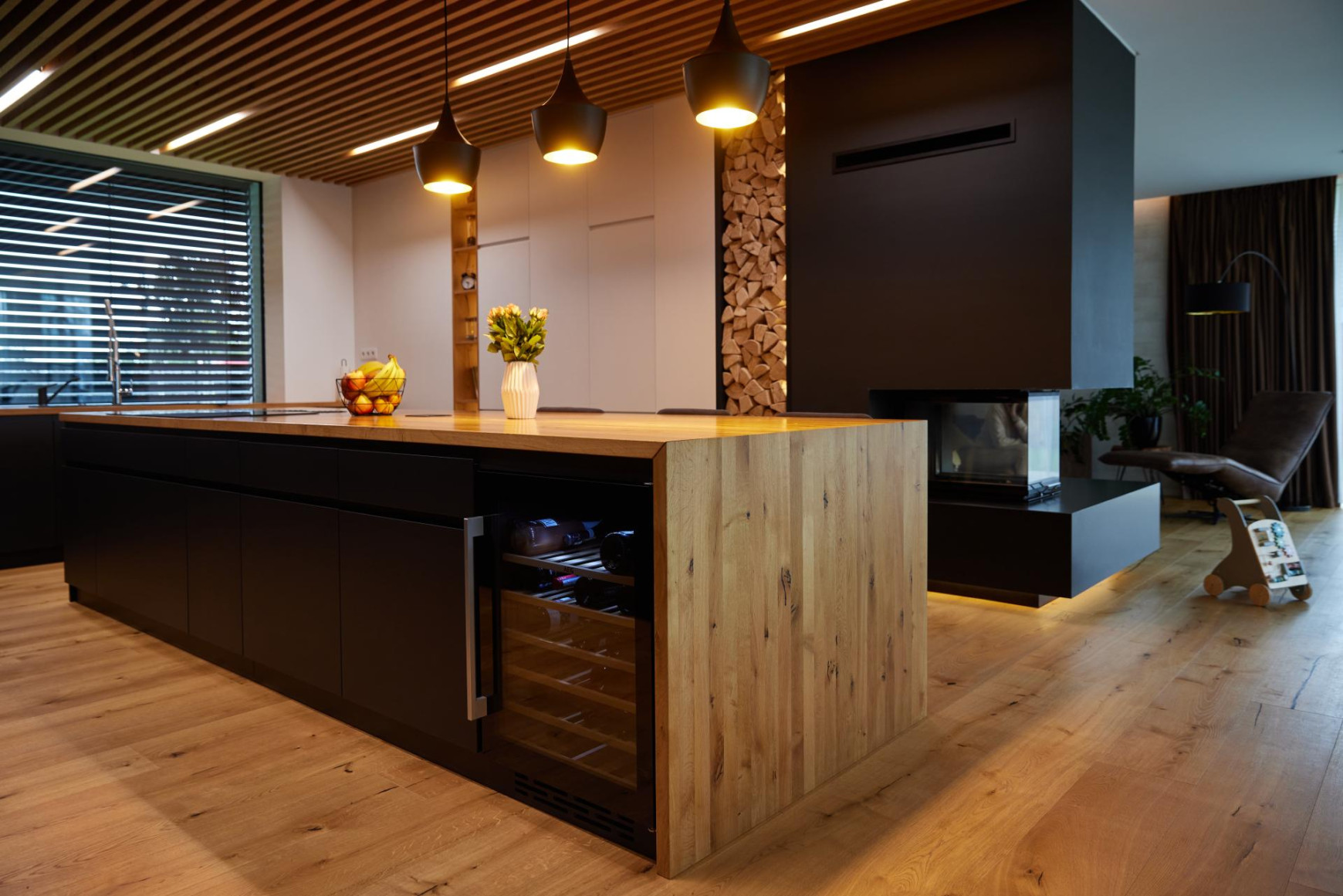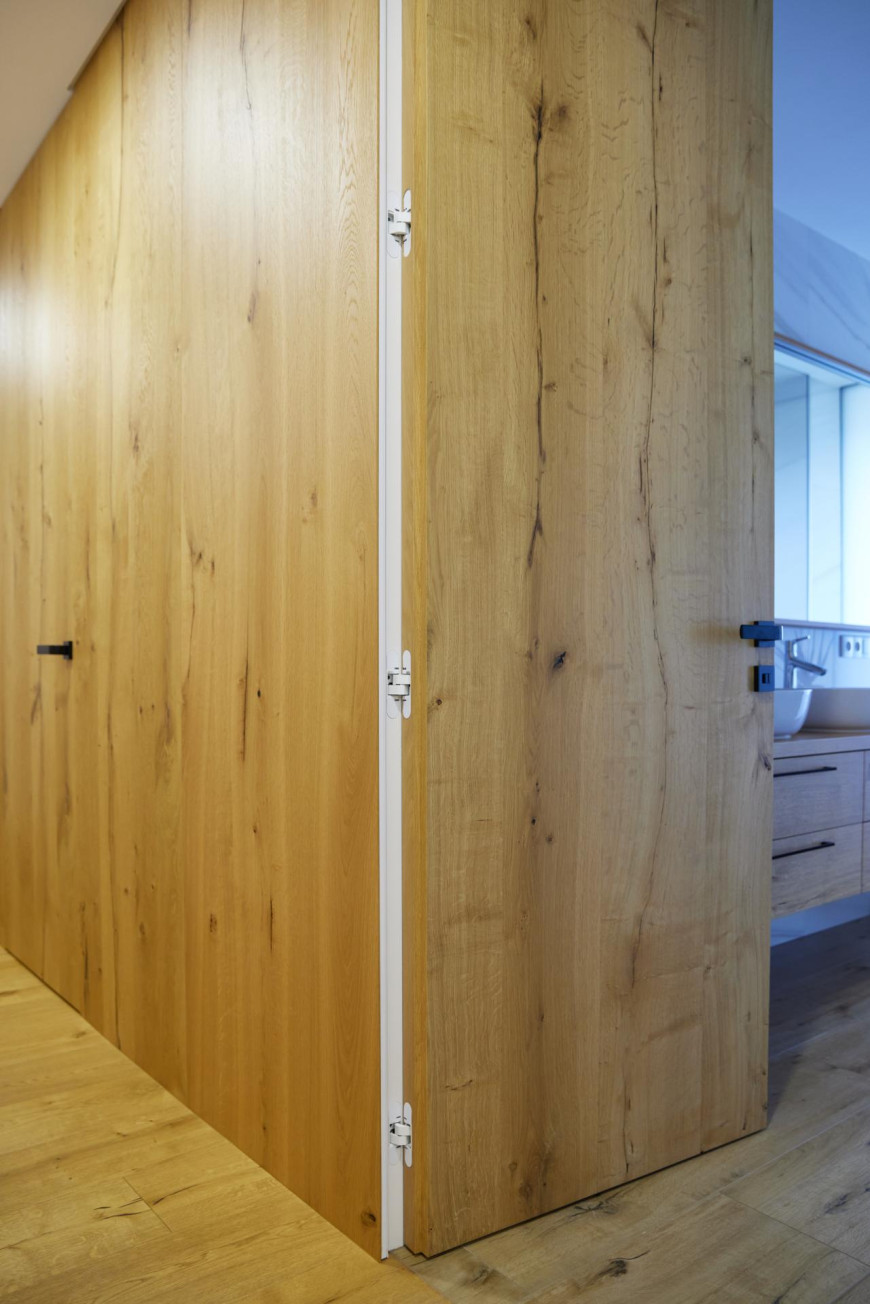 This interior captures a moment of timeless elegance, where oak veneer meets refined RAL finishes to create a truly distinctive and sophisticated atmosphere. The entire space radiates a sense of high standard, with detailed slatted elements on the ceiling and behind the TV wood clad a subtle touch of sophistication. Wood clad and doors in oak veneer with concealed doorframes enhance the overall feeling of craftsmanship and perfection.