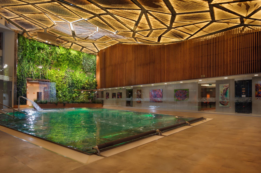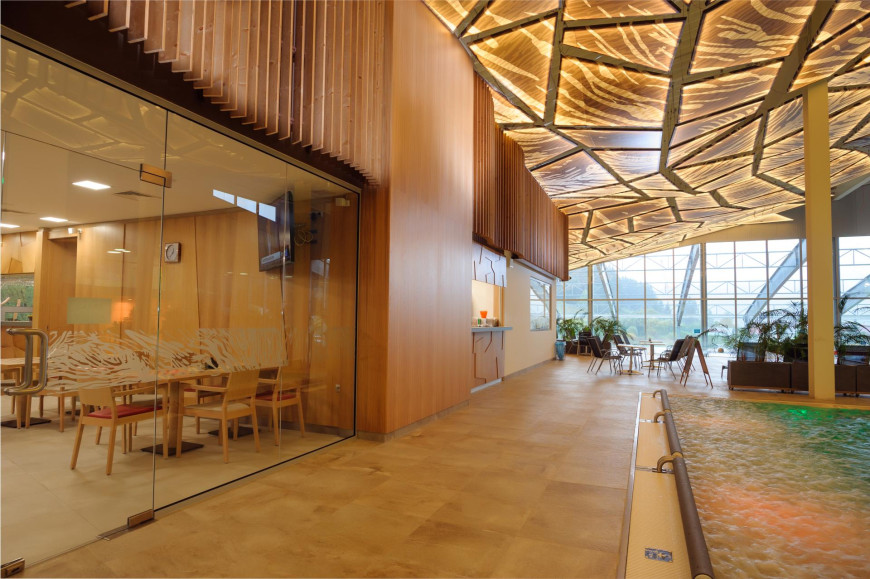 Gothal in Liptovská Osada offers a unique wellness zone with wooden ceiling frames covered in fabric featuring an original design and integrated LED lighting. Wooden clad, doors, and flower boxes crafted by our company add a stylish and natural touch to the space. Every detail is thoughtfully designed with utmost care, ensuring a perfect experience for visitors.