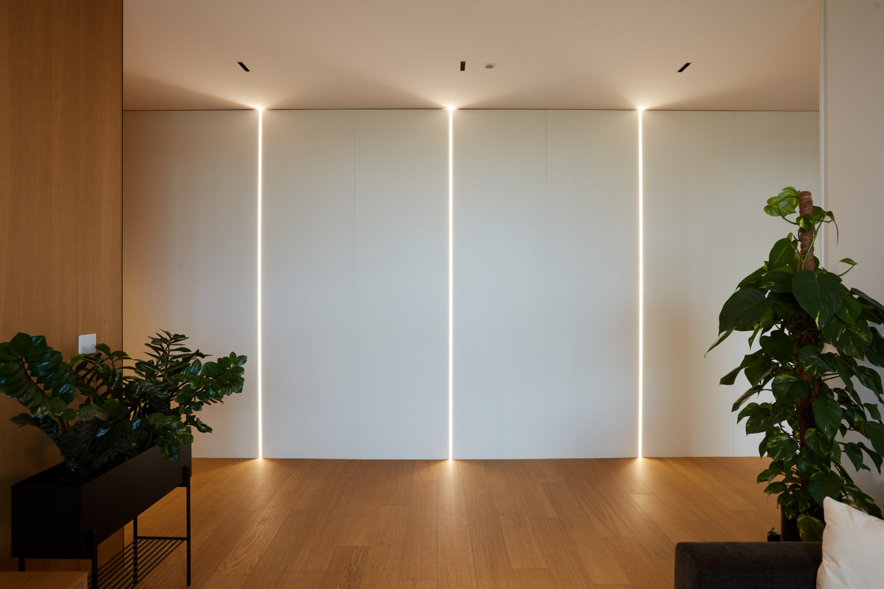 Dýha dub radial v kombinácii s RAL odtieňom dominuje interiéru tohto domova. Kuchyňa s dvierkami v nádychu bieleho odtieňa pridáva do priestoru sviežosť a moderný šarm. Ako kuchynská doska bol použitý kameň Technistone. Steny s obložením z dýhy dubu radial a dvere diskrétne osadené v skrytých zarubniach zabezpečujú eleganciu a dokonalú integráciu do celkového dizajnu. Dokonalé dotiahnutie celkovej atmosféry poskytuje LED podsvietenie obkladov, ktoré dodáva priestoru útulný a pôsobivý nádych.Celkový útulný dizajn domu je dotiahnutý do dokonalosti, pričom sa zvláštnou jemnosťou kontrastujú betónové steny s teplou dýhou dubu radial. Tento harmonický súzvuk moderného industriálneho štýlu s prírodnými prvkami vytvára atmosféru, ktorá pôsobí osviežujúco a inšpiratívne.
