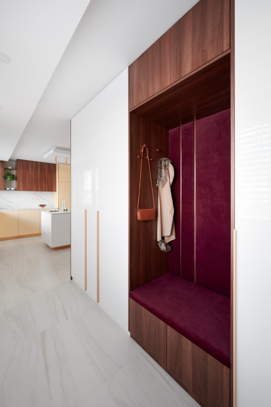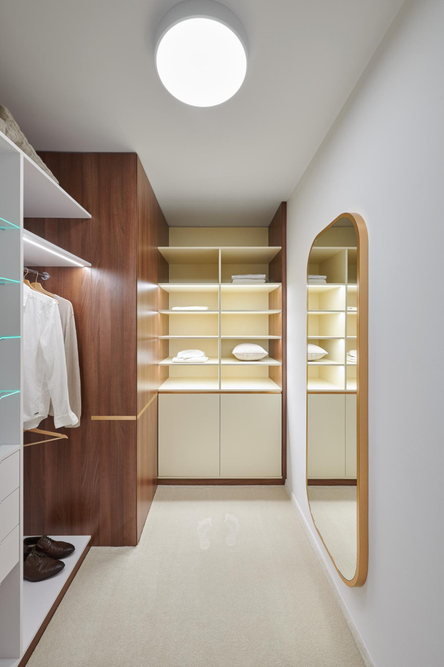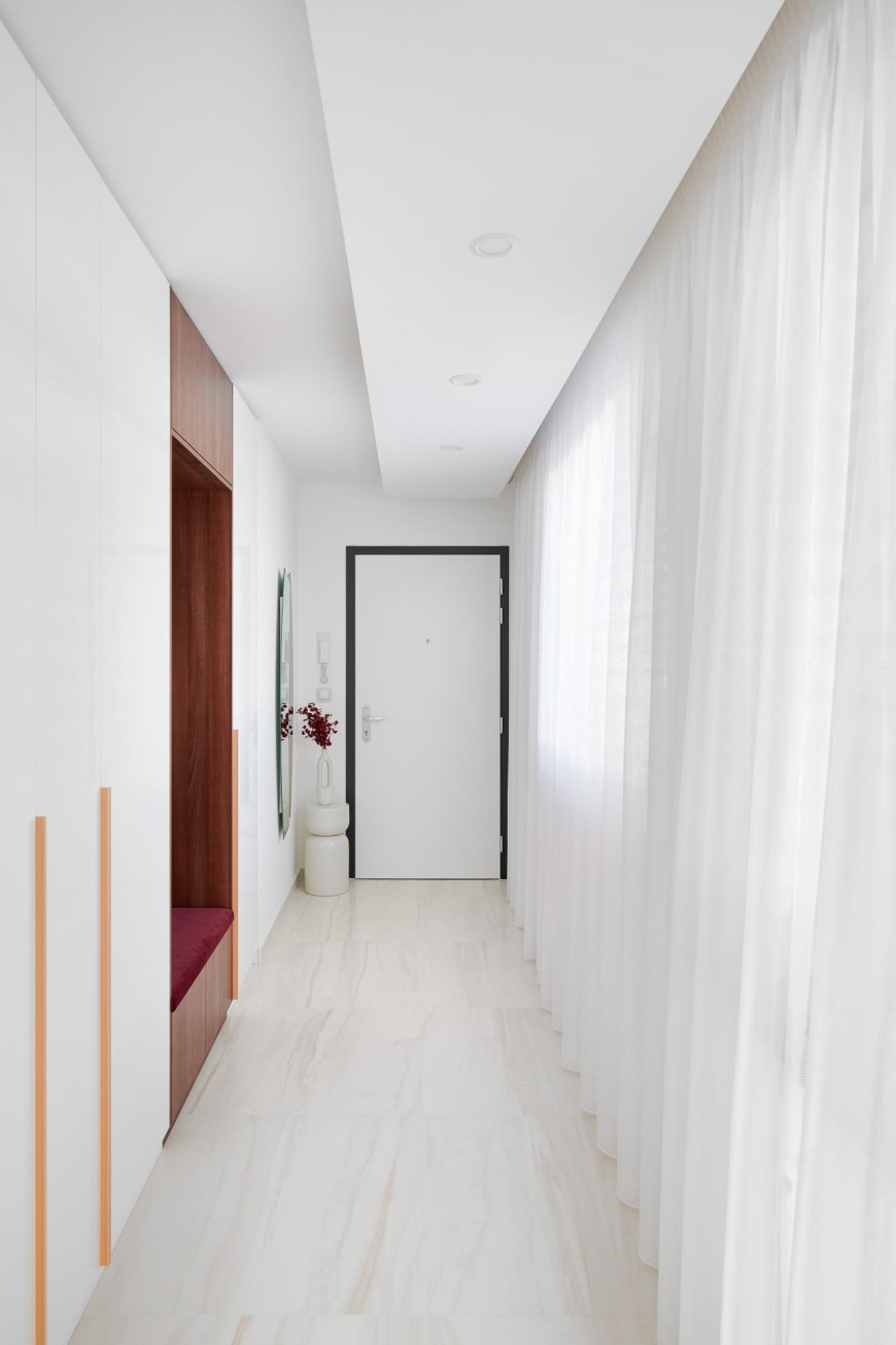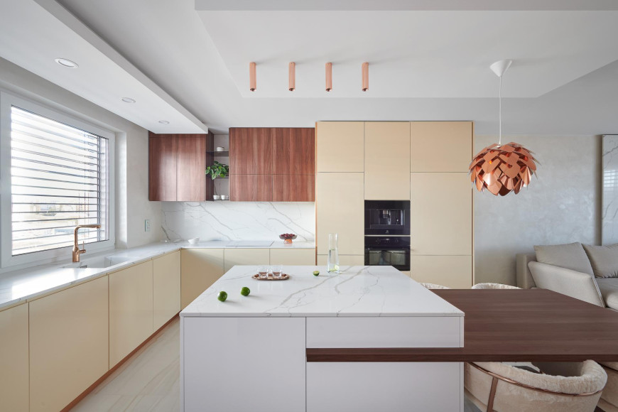 Pri vytváraní interiéru tohto bytu dominuje použitie dyhovania v kombinácii so striekaním, čo vytvára jedinečný a moderný dizajn. Kuchynská pracovná doska je vyrobená z umelého kameňa Technistone, pričom na tomto projekte sme úzko spolupracovali s externou firmou. Táto kombinácia materiálov a spolupráca s odborníkmi umožňuje dosiahnutie vysokého štandardu kvality a estetiky, čím sa zabezpečuje vytvorenie nadčasového a funkčného interiéru pre našich klientov.