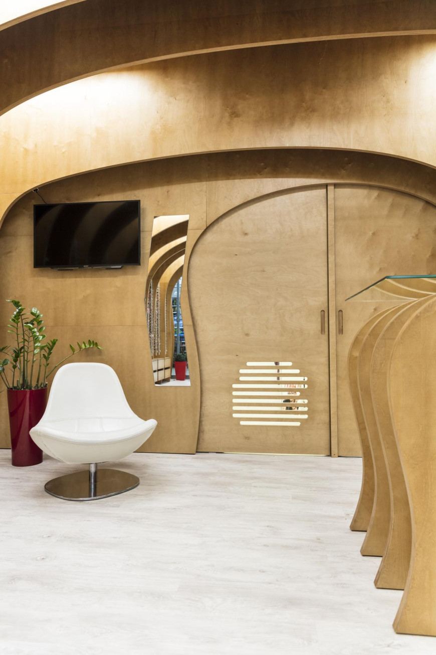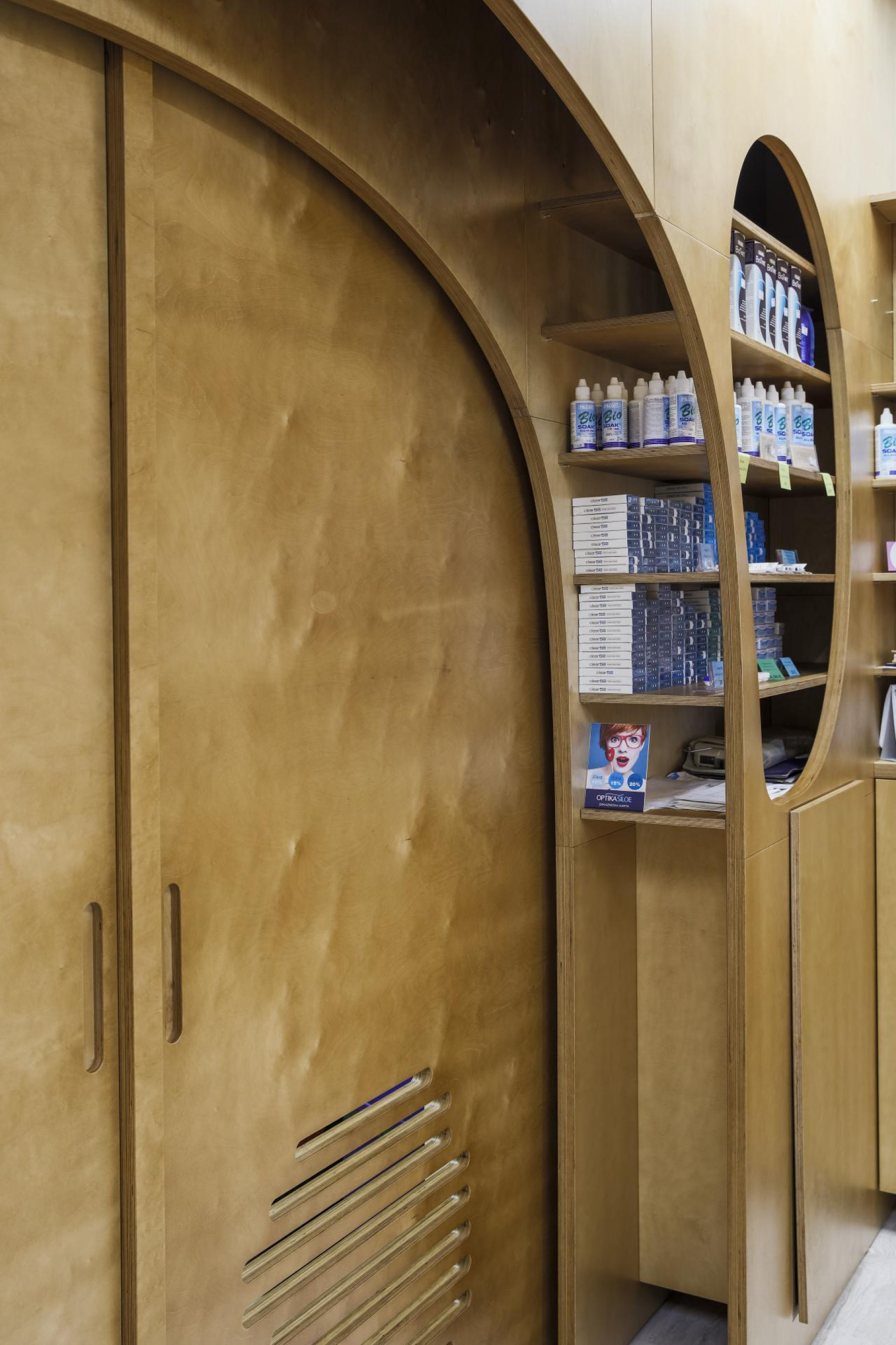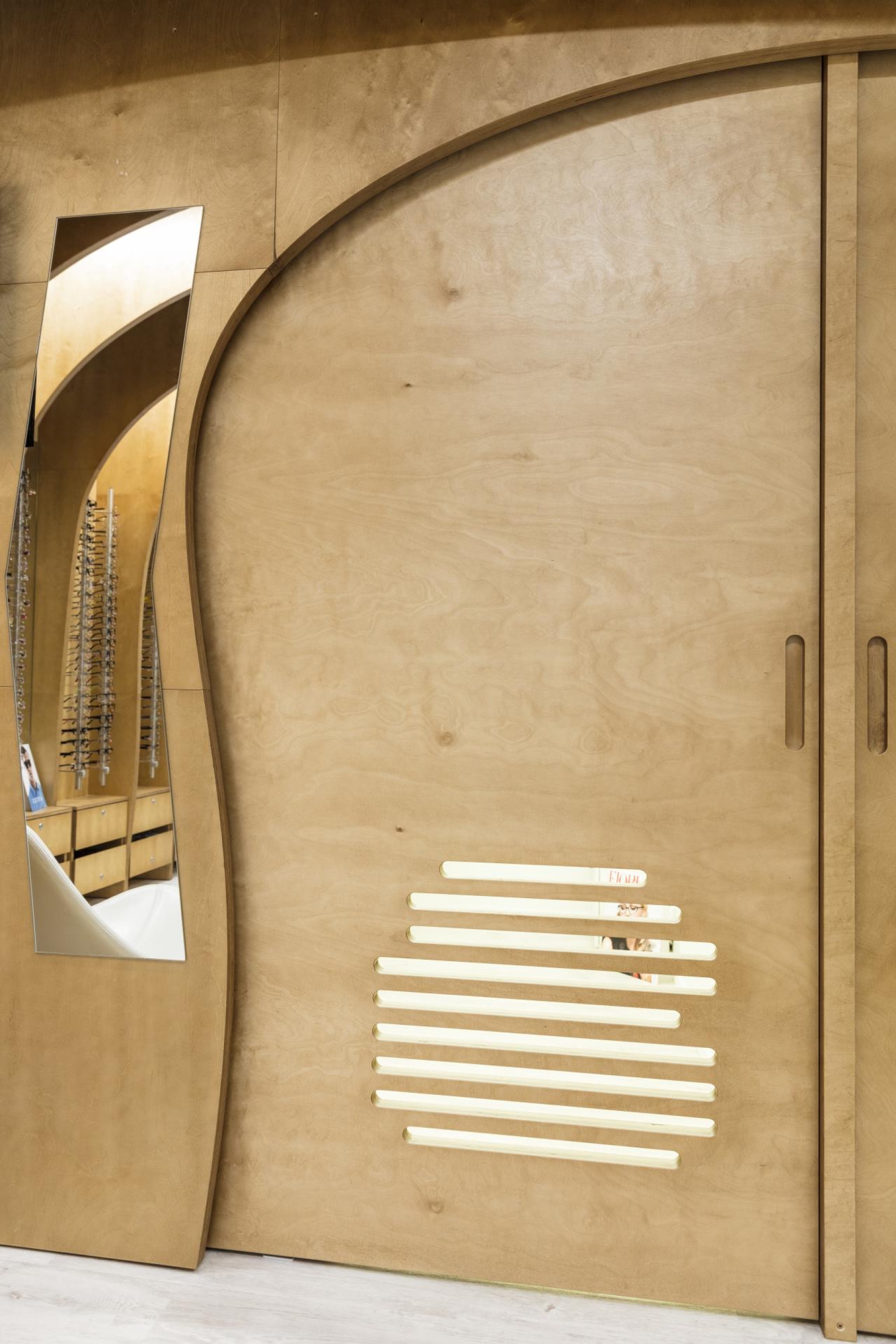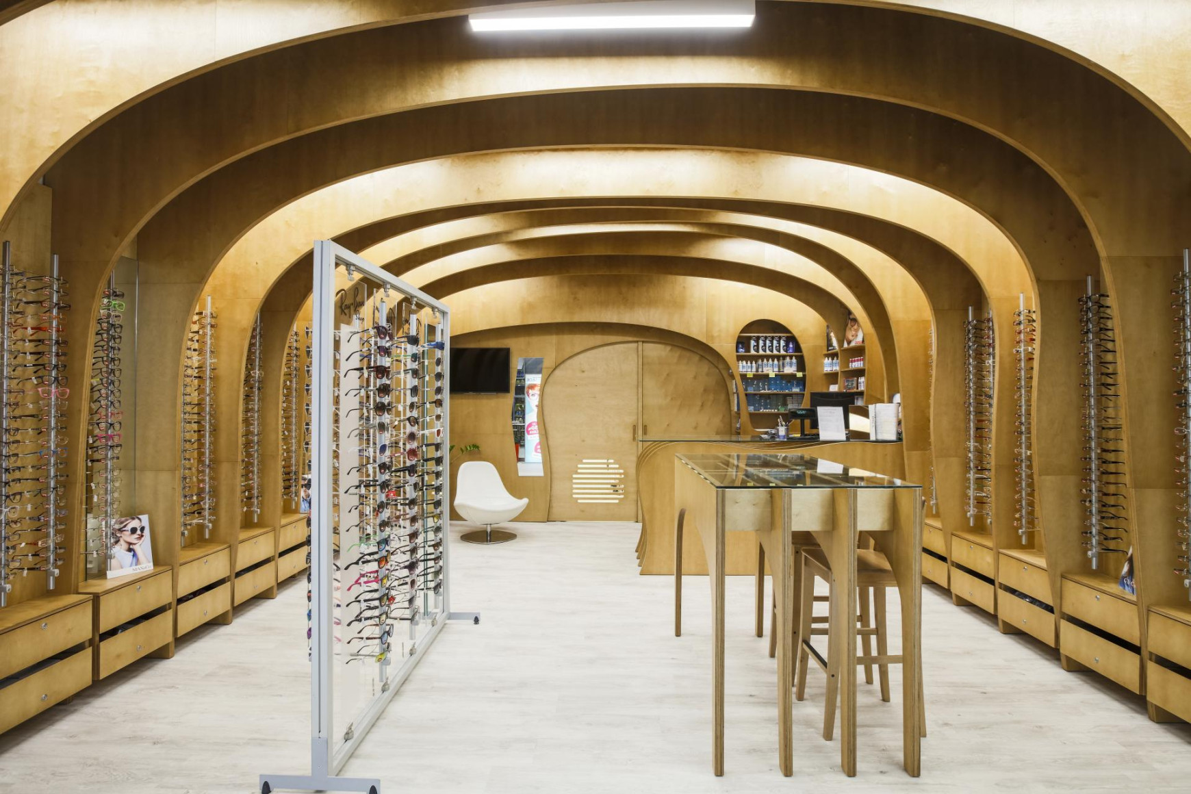 Projekt Očnej Optiky Siloe, realizovaný ešte v roku 2017, je príkladom veľkoryso riešeného priestoru s dôrazom na maximálne využitie dreva ako tvarovateľného dizajnového prvku. Preglejka a tvarované lamely sa stali kľúčovými prvkami tohto interiéru, pridávajúc mu jedinečnú textúru a štýlový charakter. Tento dizajnový prístup nielenže poskytuje estetickú hodnotu, ale aj vytvára prirodzenú a príjemnú atmosféru, ktorá zákazníkov vítala do optiky s útulnosťou a eleganciou.